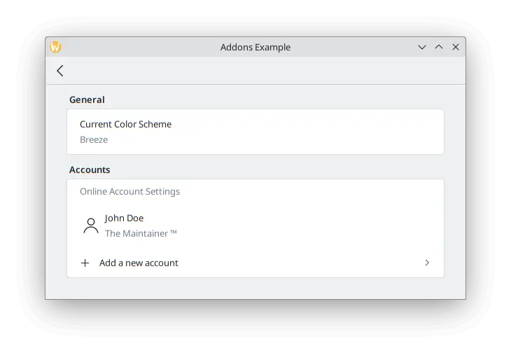 The FormButtonDelegate is visually similar to a FormTextDelegate, but it is clickable and shows an arrow pointing to the right. We used it in the Kirigami Addons introduction before.